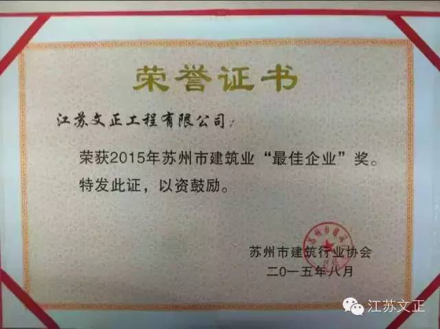 苏州市建筑业“最 佳企业(优秀企业)”、“优秀企业家(企业经理)”奖是由苏州市建筑行业协会评审,旨在表彰为苏州市建筑行业做出贡献的先进单位及先进个人的荣誉奖项,每年评审一次。近日,2015年度“最 佳企业”荣誉称号出炉,文正公司榜上有名。同...